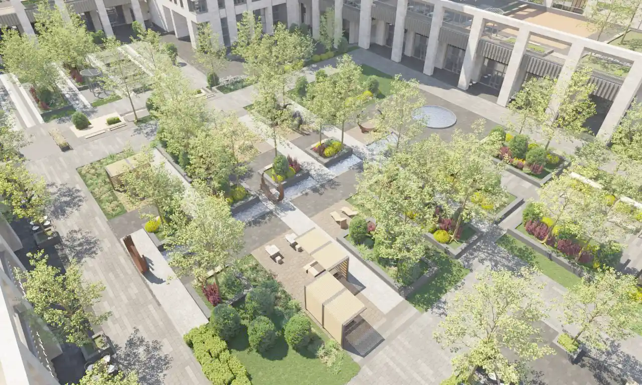 Благоустройство двора включает в себя детскую и спортивную площадки. Велосипедные дорожки не предусмотрены, а площадка для сбора мусора отсутствует.