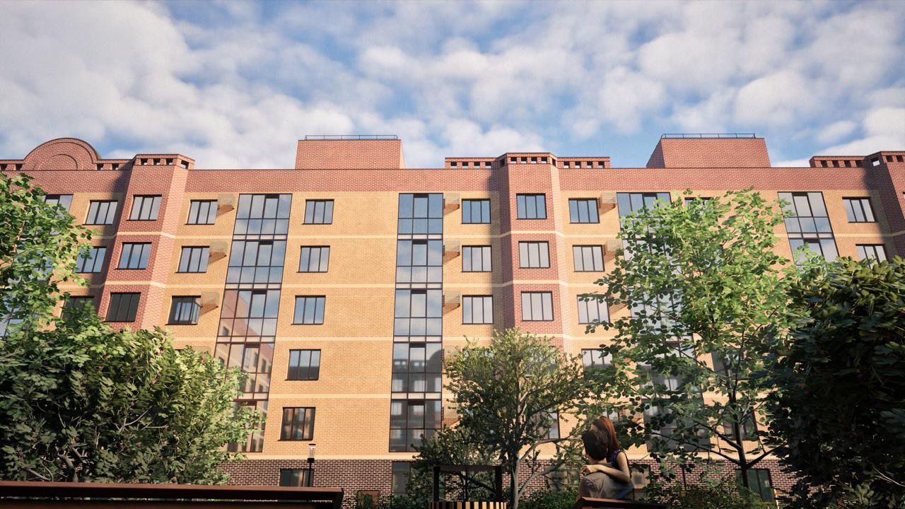 Фасады сочетают теплый песочный кирпич, глубокий бордовый цвет и выразительные панорамные окна, создавая гармоничный и современный облик.