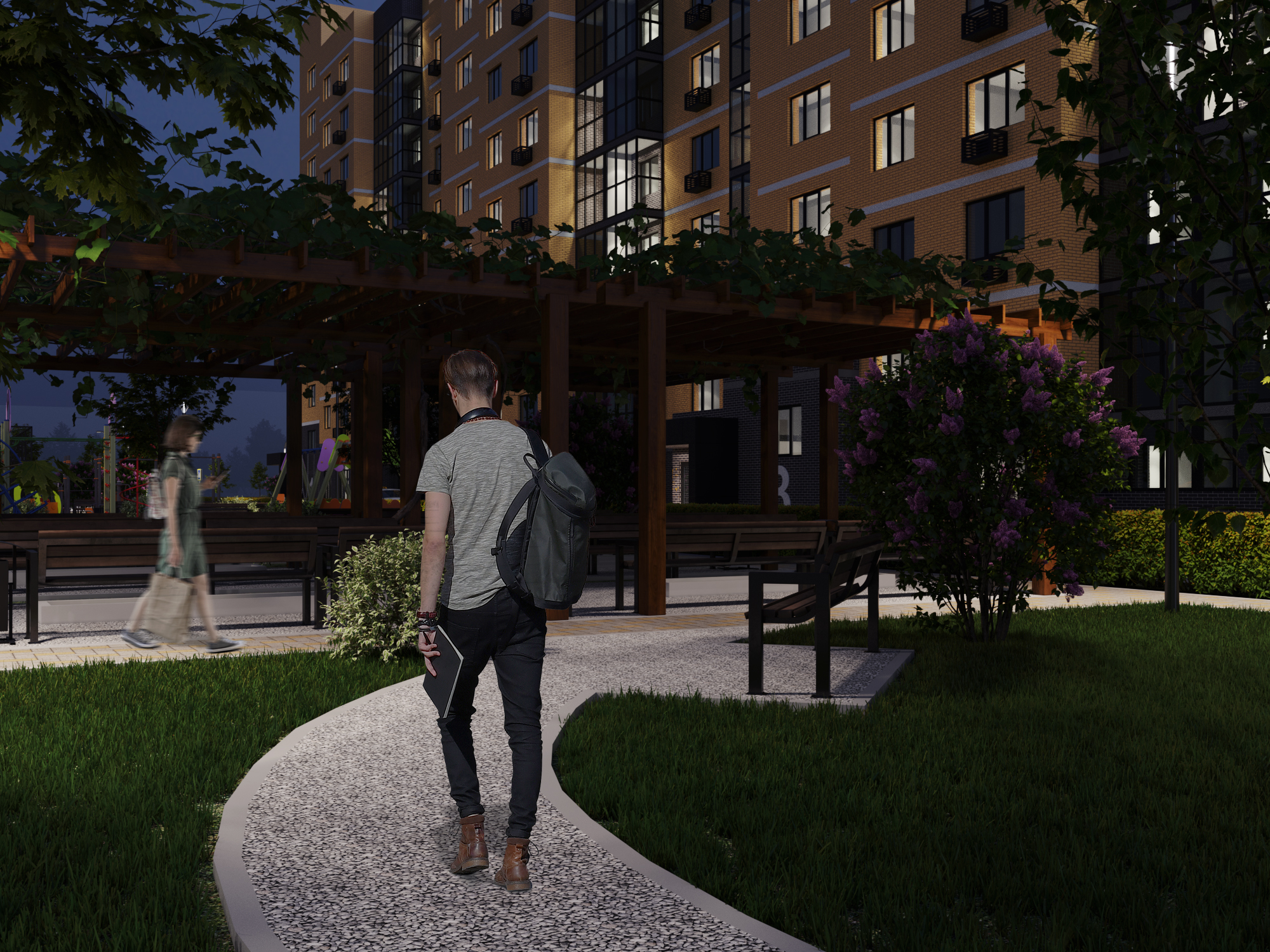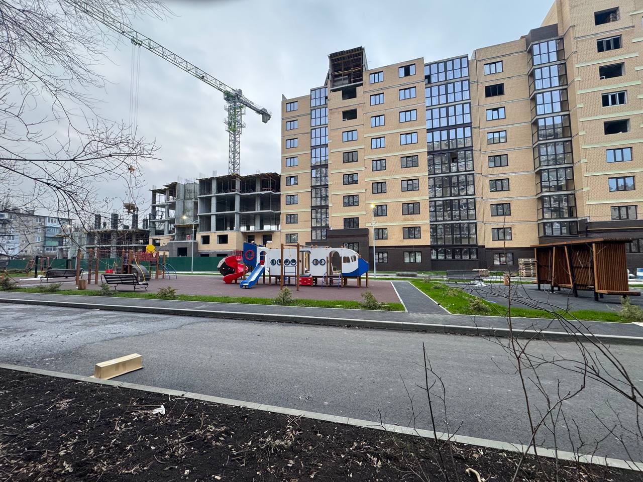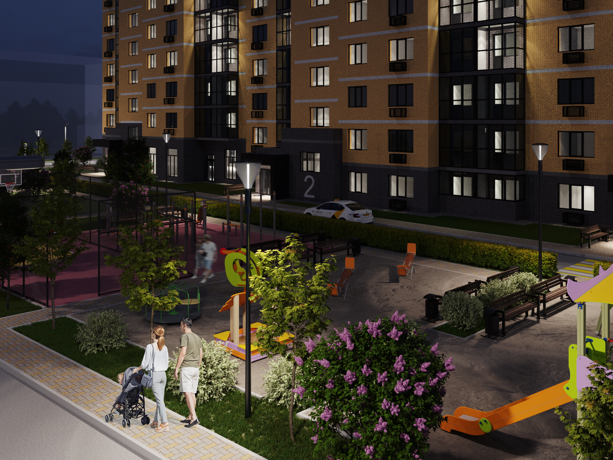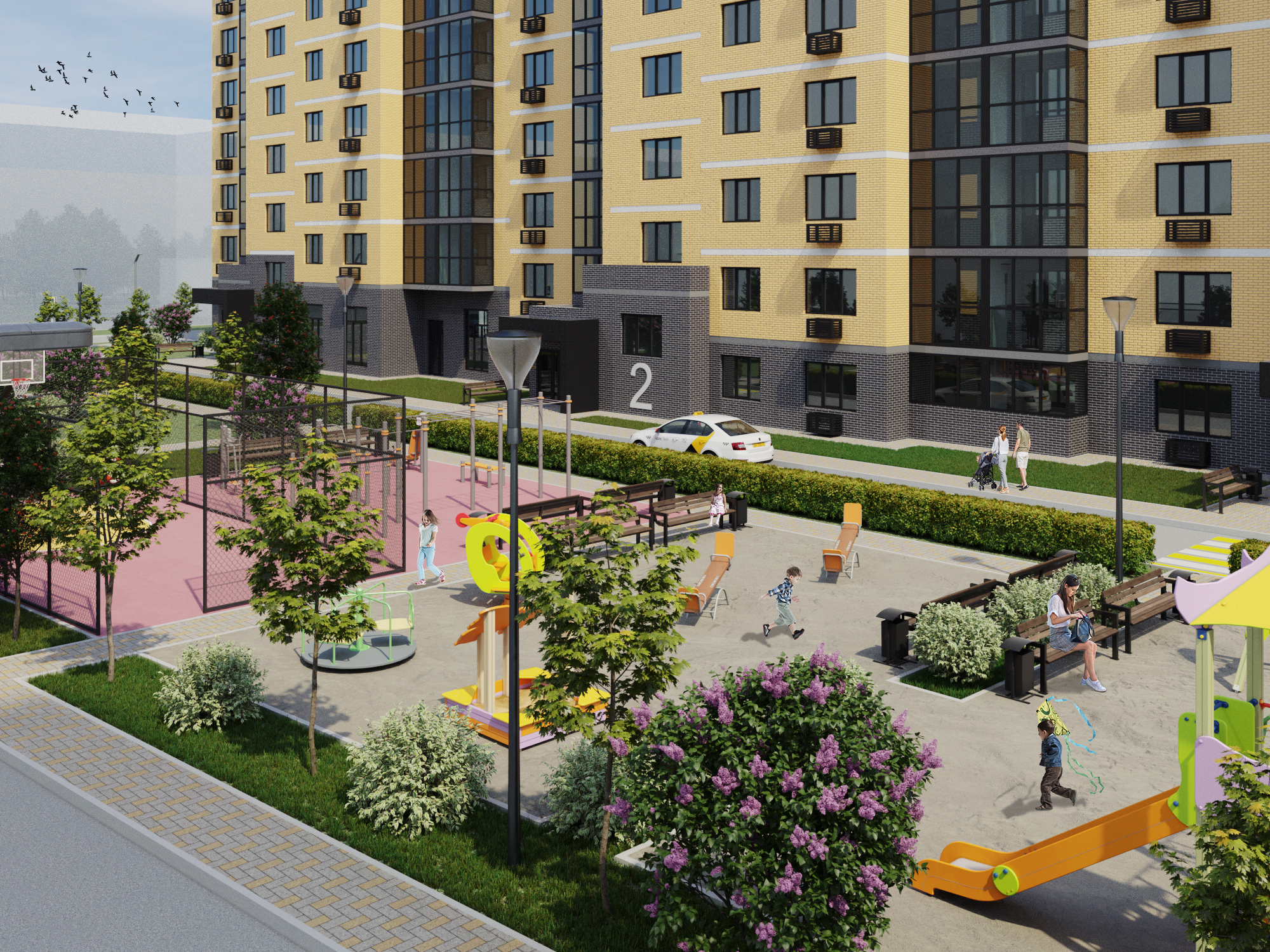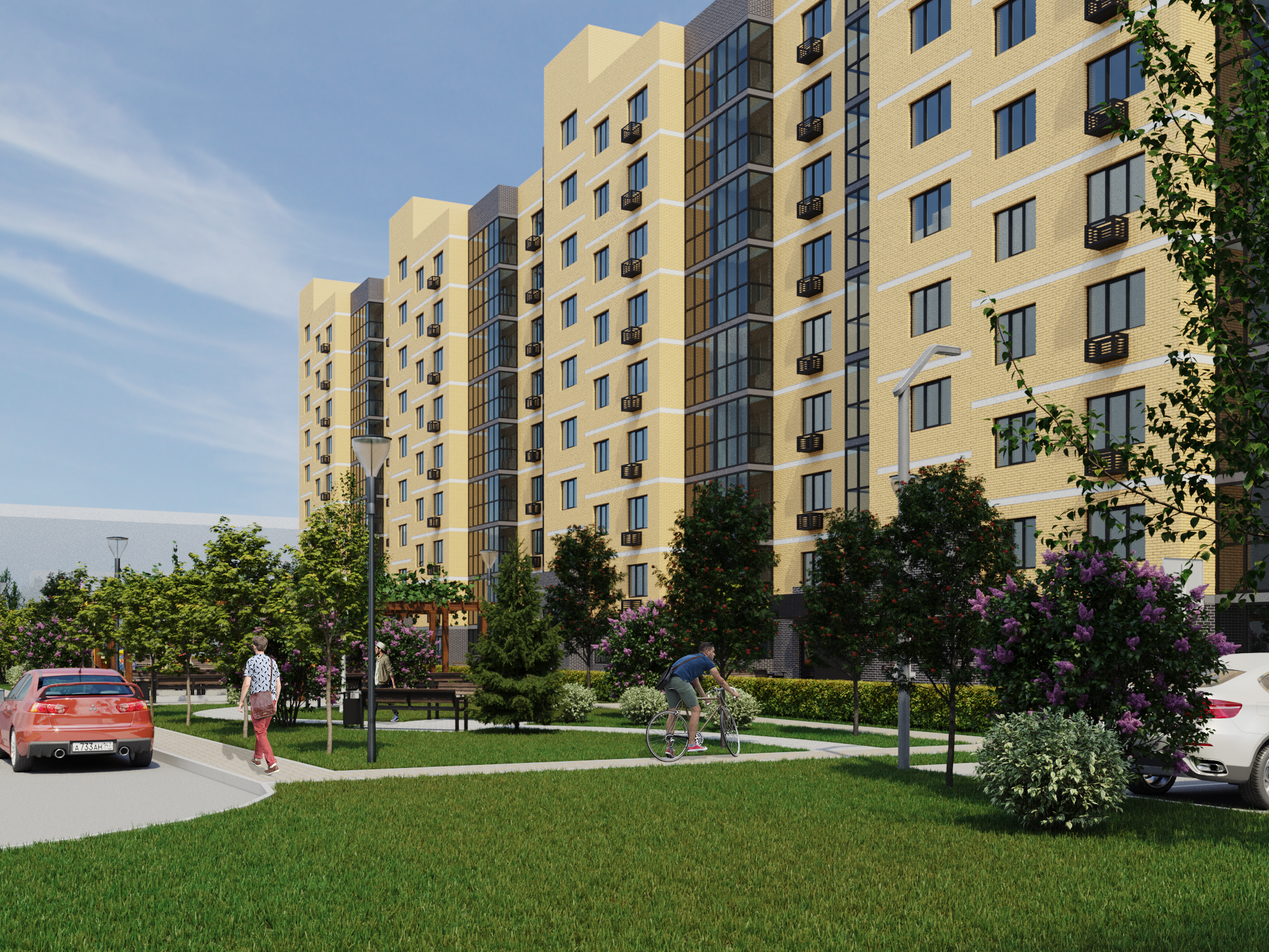 Во дворе МЖК Авиатор будут расположены детская и спортивная площадки, а также две площадки для сбора мусора. Велосипедные дорожки проектом не предусмотрены.